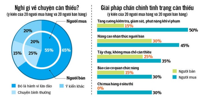 “Ngay cả hàng thịt quen mua hằng ngày, thỉnh thoảng tôi vẫn phát hiện người ta cân điêu”, người phụ nữ này bức xúc. Chị nằm trong nhóm người cho biết, từng bị cân thiếu khi mua hàng. Các trường hợp cân thiếu chỉ được phát hiện khi người mua “cảm thấy” hàng hóa không đủ trọng lượng và cân đối chiếu tại nhà. Những nơi bán hàng cân thiếu được chỉ cụ thể là ở các chợ và hàng rong, xe đẩy.