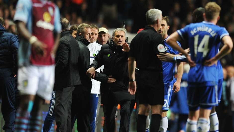 | Tháng 4/2014: Chiến lược gia 52 tuổi bị tước quyền chỉ đạo trong trận gặp Aston Villa khi cố tiếp cận trọng tài Chris Foy chỉ vì ông vua áo đen rút thẻ đỏ đối với Ramires. Hành vi gây hấn khiến Mourinho bị phạt 8.000 bảng và nhận cảnh báo về cách ứng xử trong tương lai. |