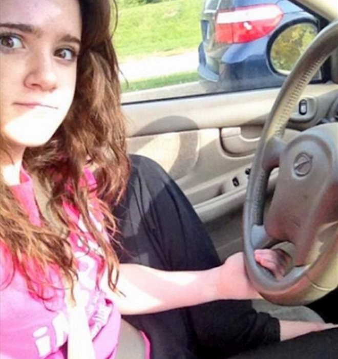 Cô gái này từng bị dân mạng ném đá trong một thời gian dài do bất chấp nguy hiểm, vô tư chụp ảnh trong khi đang lái xe. Thậm chí, một chân của cô còn co lên đặt trên ghế.