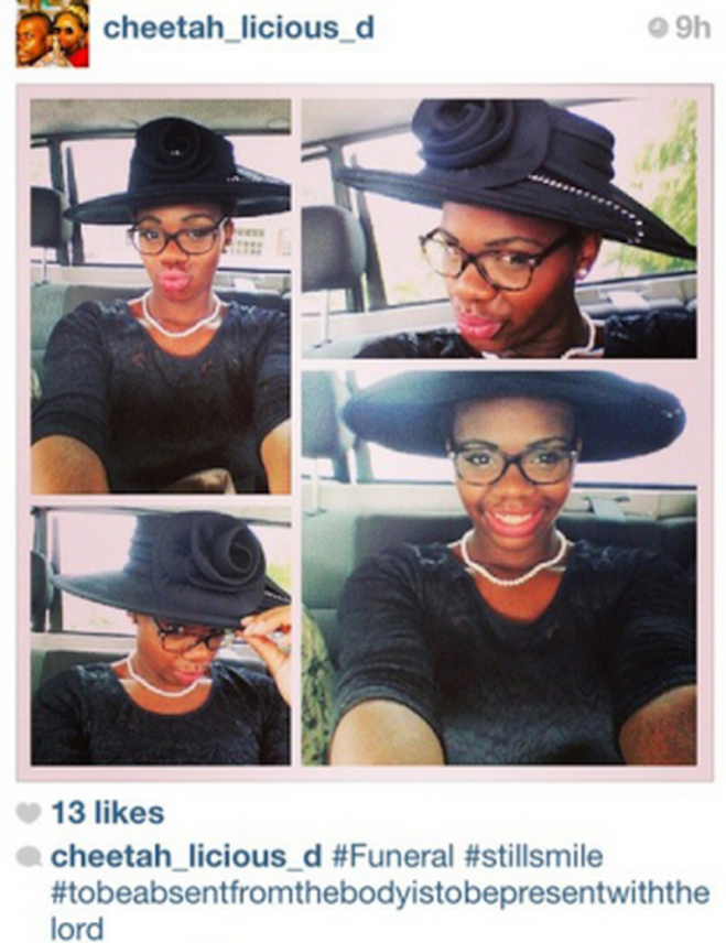 | Một cô gái khác cho thấy sự thiếu hiểu biết khi chụp ảnh ngay trong đám tang của người thân và còn cho thấy mình vẫn có thể cười. |