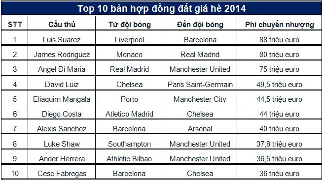 | Nhìn vào 10 bản hợp đồng đắt giá nhất hè 2014, dễ nhận thấy các đại gia đến từ Premier League tỏ ra áp đảo khi sở hữu tới 7 tân binh. Trong đó, M.U tỏ ra bạo chi nhất với 3 gương mặt chất lượng (chưa kể Falcao gia nhập theo dạng cho mượn từ Monaco) Tuy nhiên, hai ông lớn của bóng đá Tây Ban Nha là Barcelona và Real Madrid vẫn chứng tỏ khả năng chịu chơi nhất với 2 cú "big bang" mang tên Luis Suarez và James Rodriguez. Ở chiều ngược lại, các đại diện của Bundesliga vẫn theo truyền thống sử dụng cây nhà lá vườn khi không tham dự các cuộc đua "bom tấn" trên bàn đàm phán. |