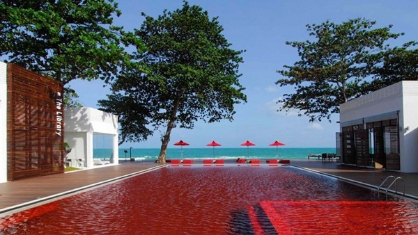 Được xây dựng trên hòn đảo Koh Samui tại Thái Lan, bể bơi Library trông giống như một cảnh trong bộ phim viễn tưởng. Thay vì màu xanh thông thường, nước tại bể bơi Library có màu đỏ máu. Màu đỏ khó quên này được tạo ra nhờ phản chiếu nền của bể bơi. |