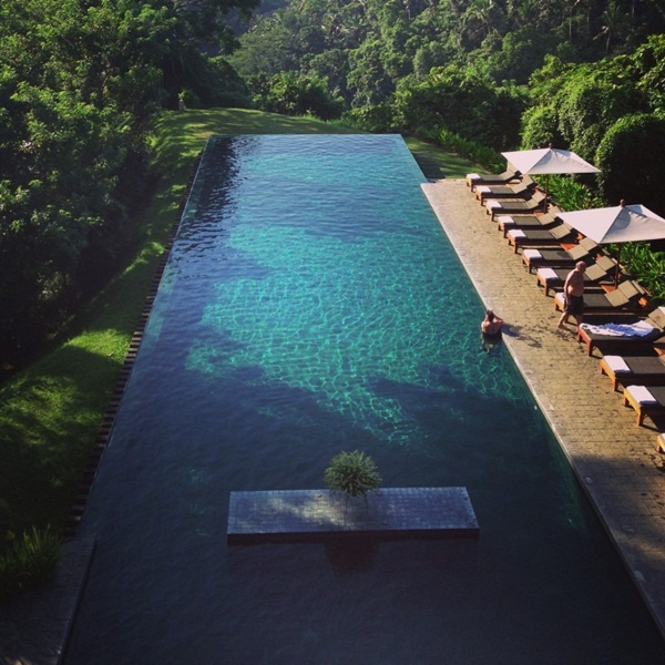 Alila Ubud là một trong những khách sạn xa xỉ nhất tại Bali, Indonesia, và bể bơi Alila Ubud là nơi hút khách nhất tại đây. Màu xanh lục của nước giúp bạn có thể nhìn thấu từ đầu tới cuối bể. Bao quanh bể bơi là rừng cây mang lại vẻ yên bình như một ốc đảo. |
