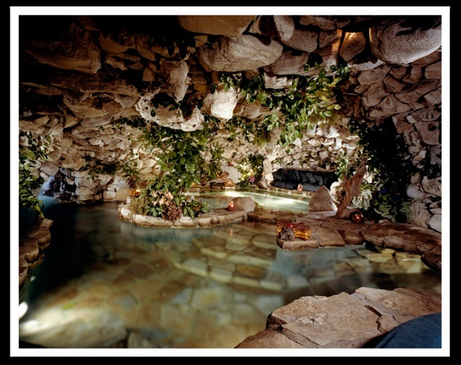 Với những thác nước chảy róc rách và ngọn đuốc sáng lấp lánh, bể bơi của biệt thự nằm bên trong một hang động, có đầy đủ tiện nghi như tivi, quầy rượu và ghế tựa.