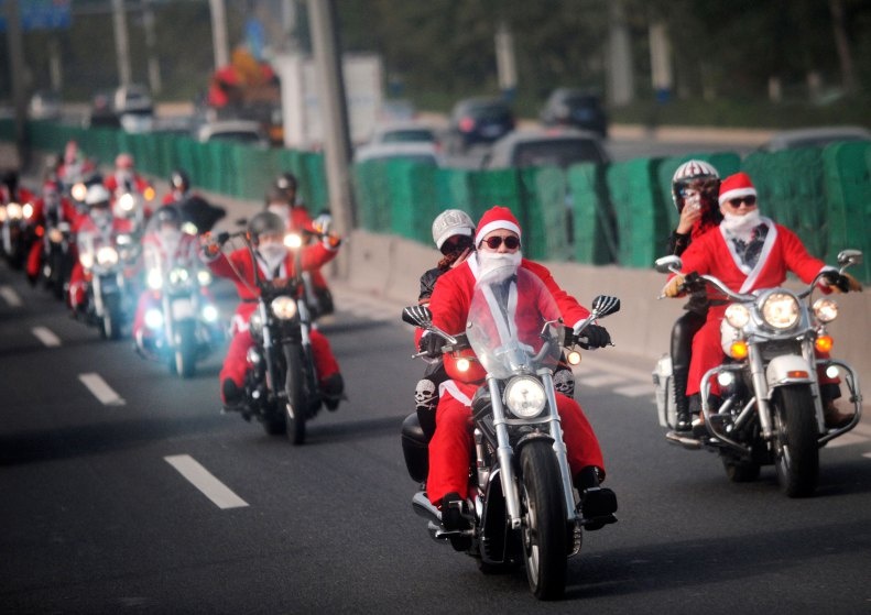 Những thành viên câu lạc bộ xe phân khối lớn Harley-Davidson hóa thân thành ông già tuyết tới tặng quà cho người già tại viện dưỡng lão ở Quảng Châu, thủ phủ tỉnh Quảng Đông, Trung Quốc. Ảnh: Reuters
