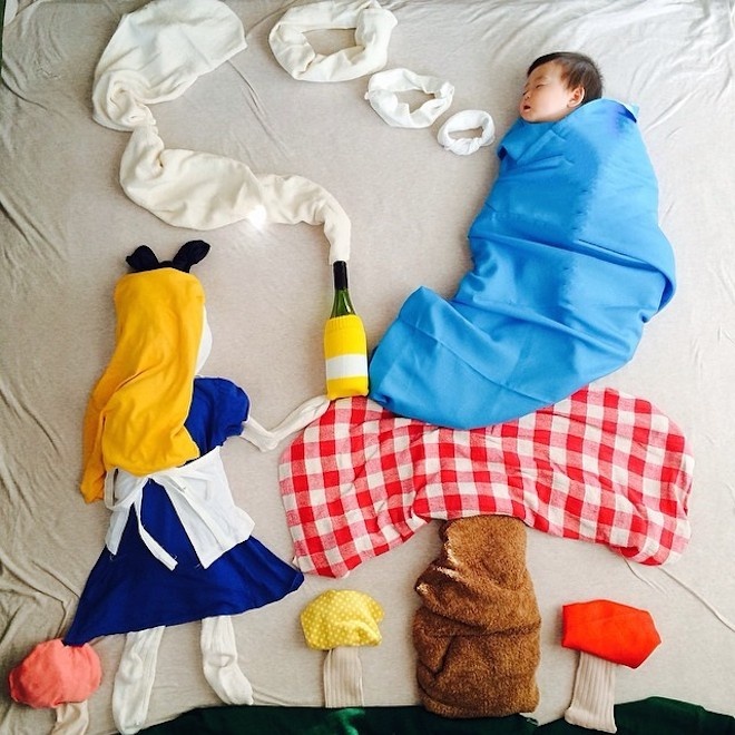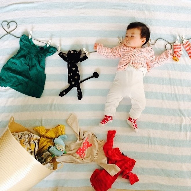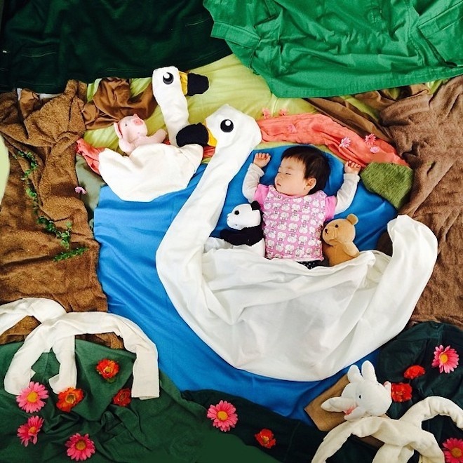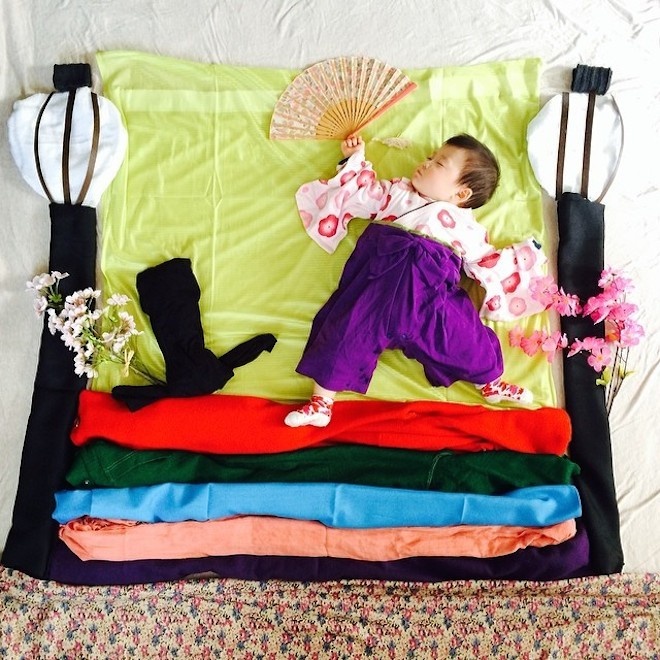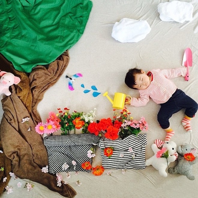 Eriko chia sẻ: "Tôi thường lên ý tưởng mỗi ngày và cố gắng sắp xếp thật cẩn thận trước khi con gái ngủ. Và khi bé thiếp đi, công việc cần làm chỉ là lén lút đặt bé vào đúng vị trí lý tưởng mình vừa làm".