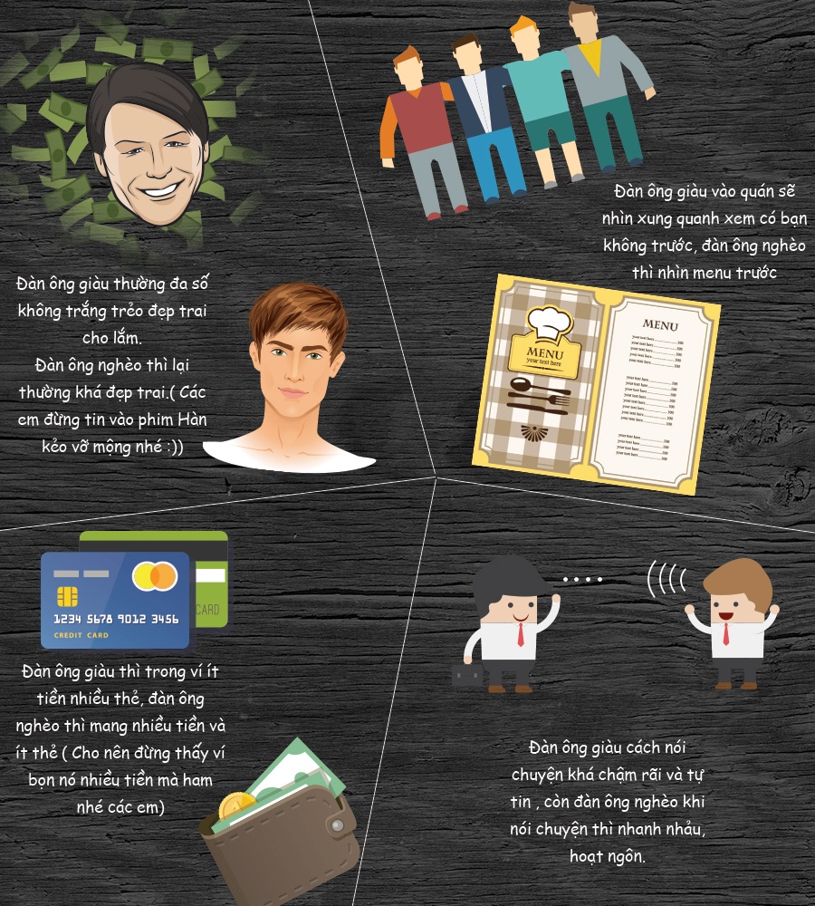 Tuy nhiên ý mình ở đây là những người đàn ông “giàu” thật, chứ không phải người có nhiều tiền. Vì người giàu thật thì phải giỏi còn người nhiều tiền có khi là tiền bố mẹ cho hoặc lô đề cá độ giàu lên trong một đêm. Mình nói là để các bạn biết mấy loại đàn ông đầy tiền bây giờ có chứ mai sau sếp xó lúc nào không biết. Nói chung sau đây mình có 10 điều giúp các bạn gái nhận ra đàn ông giàu thật, giàu từ trong ra đến ngoài để đặng mà còn tìm 'mối' cho phù hợp trong cái thời buổi kinh tế lạm phát.