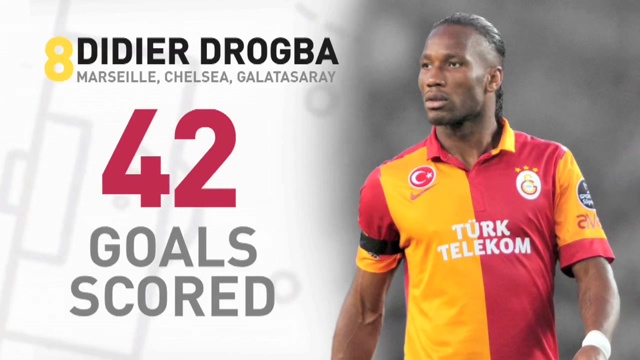 | 42 bàn thắng tại Champions League tính cho đến thời điểm hiện tại là thành tựu mà Drogba đã đạt được trong màu áo của Marseille, Chelsea và Galatasaray. Tất nhiên, con số này có thể sẽ thay đổi bởi tuy đã 35 tuổi nhưng anh vẫn thể hiện bản năng sát thủ hết sức đáng gờm |