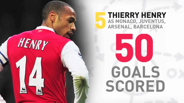 "Con trai thần gió" đã ghi 50 bàn thắng trong sự nghiệp thi đấu đỉnh cao ở đấu trường Champions League trong màu áo Monaco, Juventus, Arsenal và Barcelona.