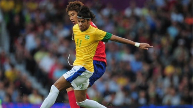| Kim Young Gwon (đỏ) trong một tình huống theo kèm Neymar. |