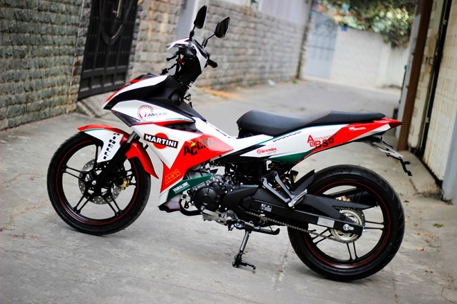 Chiếc Exciter 150 màu trắng đỏ được một xưởng độ ở Sài Gòn sơn lại theo phong cách tricolore của hãng môtô Italy. Ngoài màu trắng, đỏ chủ đạo, thân xe còn được sơn logo những thương hiệu nổi tiếng trên thế giới, lấy ý tưởng từ xe đua MotoGP. Phần mặt nạ vẽ chữ ký tay đua Valentino Rossi. |