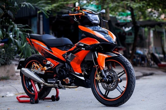9. Exciter 150 độ kiểu robot biến hình ở Cần Thơ Chiếc xe côn tay Exciter 150 mới mua của một biker ở Cần Thơ độ lại dàn áo lấy cảm hứng từ nhân vật Optimus Prime trong phim Transformer. Toàn bộ dàn nhựa zin được tạo dáng, cắt khoét, đắp thêm. Sau đó những người thợ sẽ tiến hành chà trét, xử lý bề mặt để tạo các góc cạnh, đường nét, hốc gió. Một số phụ kiện hàn hiệu trên x như bao tay, gù xéo, dình dầu trước và sau của Rizoma, gương chiếu hậu Elisse, tay thắng Brembo RCS19 và Brembo Billet. |