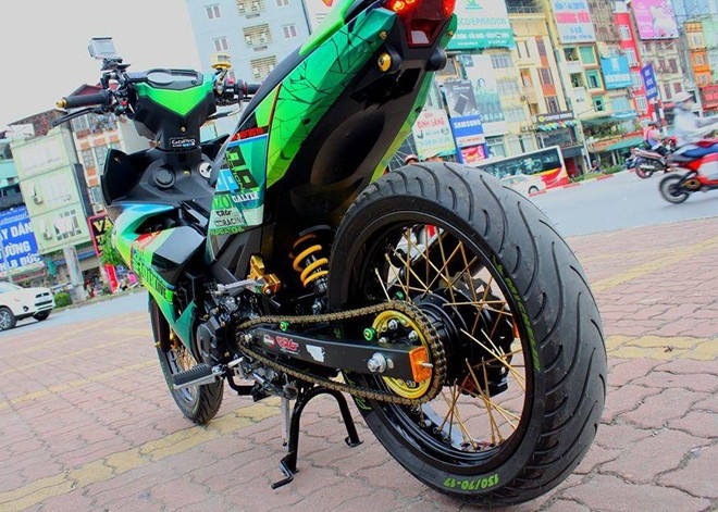 6. Exciter 150 lột xác với gói độ gần 140 triệu đồng Sau khi mua chiếc Exciter 150 RC, chủ nhân chiếc xe là một biker ở Hà Nội đã quyết định độ dàn áo sơn airbrush tem đấu, lấy màu xanh Kawasaki làm chủ đạo. Dàn áo thể hiện những câu tuyên thệ, cho thấy chất riêng của biker này. Những đồ chơi được trang bị cho xe bao gồm dàn ghi-đông được gắn tổng phanh Brembo RCB 19, cùm tăng tốc Domino, 2 cùm phanh Brembo Bilet HP Black thường thấy trên các xe môtô phân khối lớn, đĩa trước Galfer 260, đĩa sau Galfer 220. |