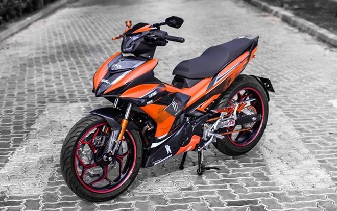5. Exciter 150 độ phong cách hầm hố Chiếc xe côn tay 150 phân khối có dàn áo sơn tem đấu nổi bật với màu cam bóng. Ngoài ra, nó còn được nhấn mạnh ở những góc cạnh khiến chiếc xe vốn đã thể thao nay còn hầm hố hơn. Dàn đồ chơi trên xe như phuộc trước Racing Boy, chống đổ Biker, tay thắng Racing Boy, tay côn Brembo Billet, bình dầu tay thắng trước Racing Boy, gác chân sau Biker, xi-nhan sau Rizoma Avio, đèn LED Koso, pô Leovince Scoot, kính chiếu hậu Rizoma Elisse. |