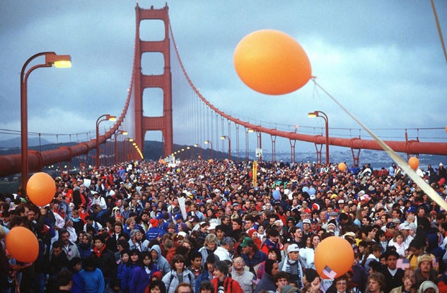 Cây cầu biểu tượng của thành phố San Francisco, Mỹ, mặc dù chưa bao giờ thực sự bị phá hủy, nhưng đã gặp nhiều nguy hiểm trong quá trình xây dựng. Dàn giáo và những đợt thủy triều khi thi công phần móng làm 911 công nhân thiệt mạng. Năm 1951, toàn bộ tuyến đường bị phong tỏa trong vài giờ khi vận tóc gió lên tới 113 km/h, khiến cây cầu rung mạnh. Cầu Tacoma Narrows, cây cầu có chung nhà thiết kế với cầu Cổng Vàng, bị sập khi gió thổi với tốc độ 65 km/h, 10 năm trước đó. Hư hại cấu trúc xuất hiện tại cầu Cổng Vàng khi gió thổi mạnh làm cầu bị cong đến mức đèn đường chạm cả vào các cáp treo. Cây cầu suýt bị phá hủy theo lời cựu kĩ sư trưởng Daniel Mohn. Sức nặng của xe cộ, giao thông đã có thể gây nên một thảm họa nếu các nhân viên không ứng phó kịp thời. |