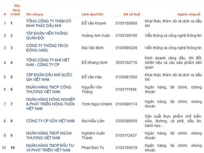 Theo bảng xếp hạng 1.000 doanh nghiệp đóng thuế thu nhập nhiều nhất năm 2013, Tổng công ty thăm dò và khai thác dầu khí là đơn vị có khoản đóng góp cho ngân sách lớn nhất. Tiếp đến là những cái tên quen thuộc trong ngành viễn thông như Viettel, MobiFone và 4 ông lớn ngành ngân hàng. Công ty cổ phần Sữa Việt Nam của bà Mai Kiều Liên đứng thứ 8 về số đóng góp cho ngân sách, là đơn vị thuộc ngành thực phẩm duy nhất lọt top 10.