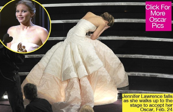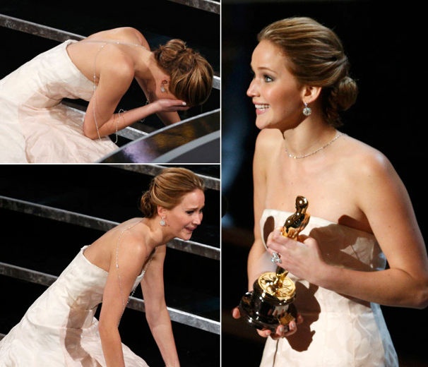 Jennifer Lawrence ngã khi đang bước lên sân khấu nhận giải tại lễ trao giải Oscar 2013.