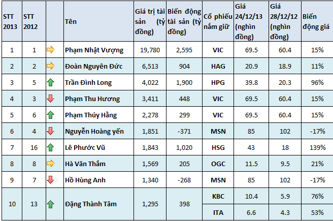 | Top 10 người giàu nhất sàn chứng khoán 2013. |