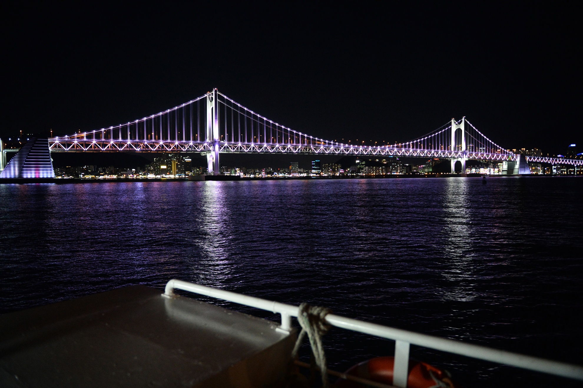 | Địa điểm 3 : Dịch vụ tàu du lịch chở khách đi một vòng trên biển ngắm thành phố và cây cầu Gwangan. Đây là cây cầu dài thứ hai của Hàn Quốc chỉ sau cầu Incheon với độ dài 6.500 mét, cả đường dẫn là 7420 mét. Cây cầu độc đáo và là biểu tượng của thành phố Busan này được khởi công xây dựng từ năm 1994, sau một thời gian phải tạm ngừng, mãi đến năm 2002 mới khánh thành đưa vào sử dụng. |