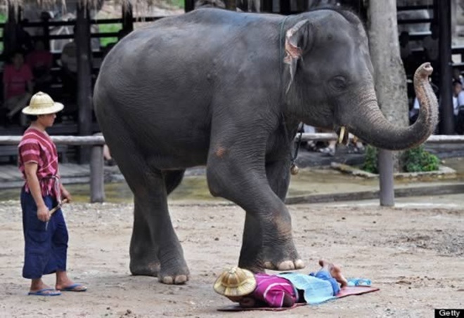 Đối với những người đang bị đau vùng thắt lưng thì massage voi là ý tưởng tuyệt vời. Những chú voi nặng 3 tấn tại một công viên du lịch ở Chiang Mai, Thái Lan được huấn luyện để giẫm chân nhẹ lên lưng bạn.