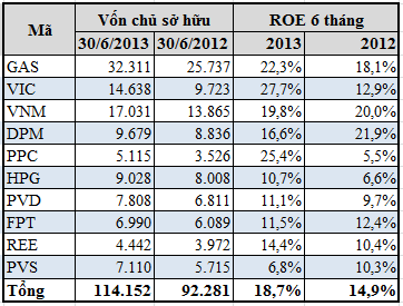 Hiệu suất vốn chủ sở hữu của các doanh nghiệp thể hiện ở chỉ số ROE. Tổng vốn chủ sở hữu cuối quý 2/2013 của 10 doanh nghiệp đạt trên 114 nghìn tỷ đồng, tăng 24% so với số dư cuối quý 2/2012. Tuy nhiên, ROE không vì vậy mà giảm đi, thậm chí còn tăng 4%, đạt 19%.