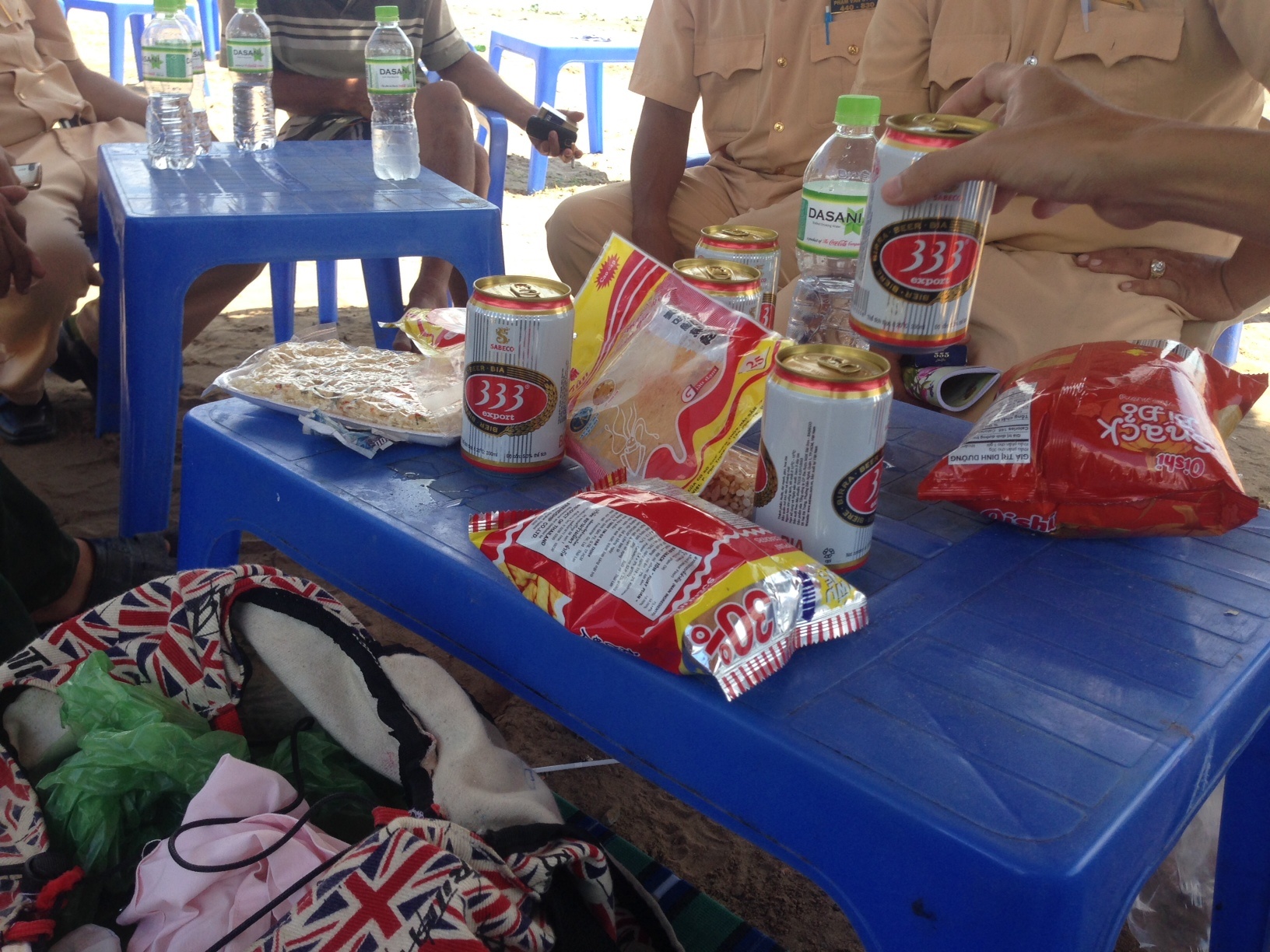 | Quần áo, bia và đồ nhậu của các học sinh trên bàn. |