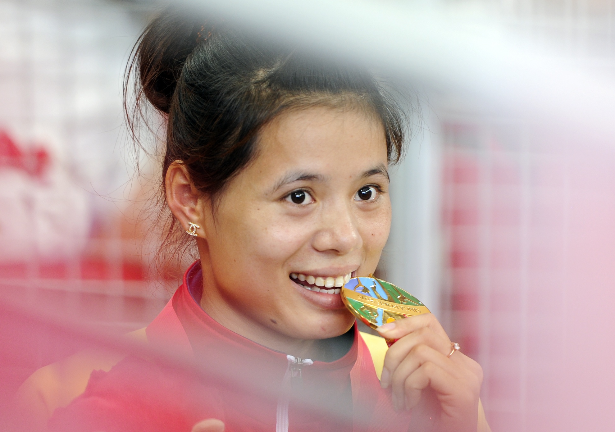 Trần Thị Len ăn mừng chiến thắng cùng huấn luyện viên sau khi giành HCV ở nội dung kiếm ba cạnh. Quốc kỳ Việt Nam tung bay trên ngọn kiếm, biểu tượng của môn thể thao quý tộc.