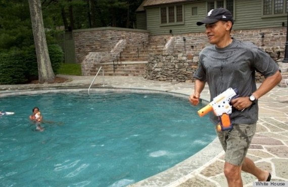 Ông chủ Nhà Trắng cầm súng phun nước chạy quanh bể bơi. |