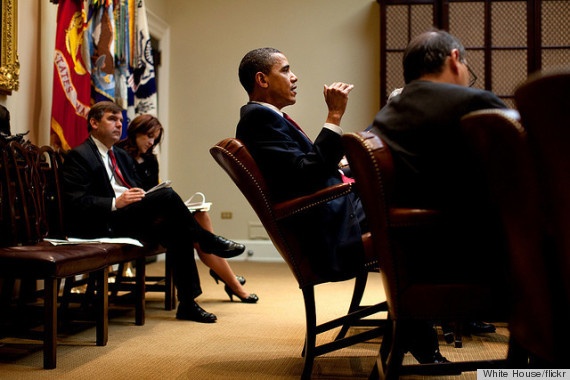Tổng thống Obama đẩy ghế ngả về phía sau trong cuộc họp, một hành động rất khó bắt gặp ở những chính trị gia khác. |