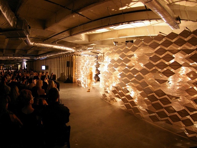 Kiến trúc sư Matt Fajkus đã sử dụng giấy treo tường làm bối cảnh và tạo ra các mảng sáng tối của show diễn thời trang.