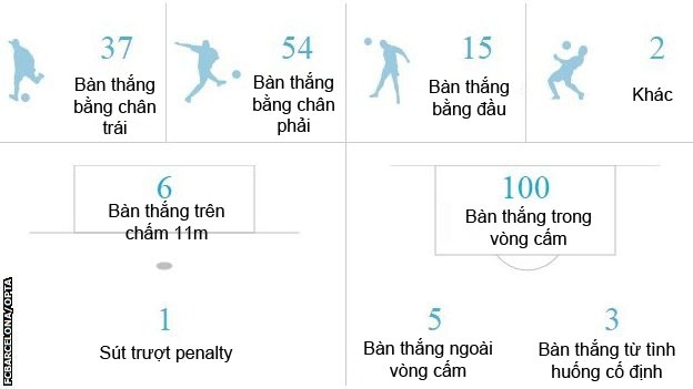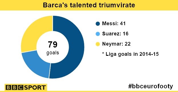 | Thành tích ghi bàn của bộ ba Messi, Suarez và Neymar tại La Liga mùa này. Đồ họa BBC. |