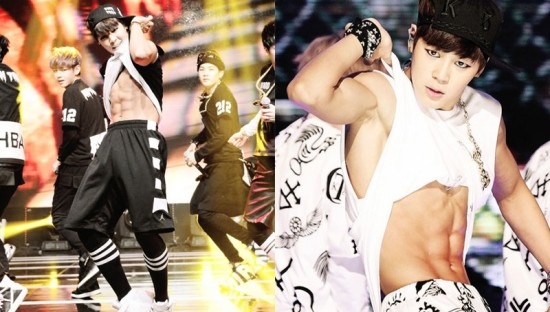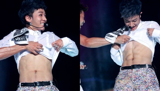 | Hành động hào hứng vạch áo này của Ki Kwang (B2ST) chắc chắn nhận được sự ủng hộ bằng một tràng hú hét của hàng ngàn fan bên dưới. |