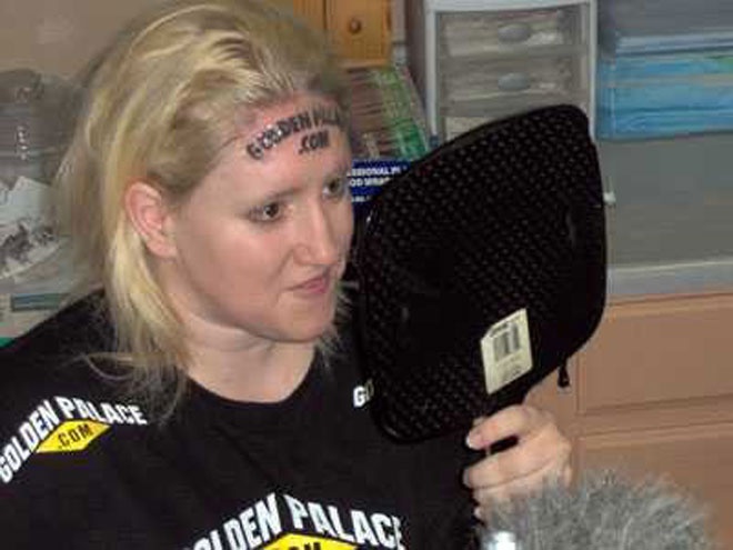 | 5. Bán trán của mình: Trường hợp này thuộc về bà mẹ Utah Kari Smith. Vì muốn có tiền chi trả cho việc học hành của cậu con trai Brady, người mẹ đã biến bản thân thành một quảng cáo đi bộ, bằng cách bán diện tích trán của mình. Cô sẽ xăm khẩu hiệu của công ty nào trả giá 10.000 USD cho không gian trán của cô. |