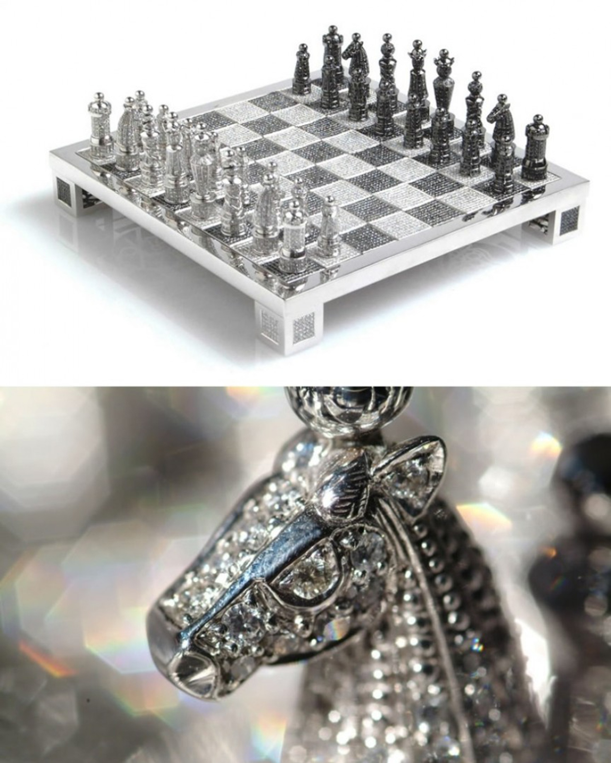 5. Bộ cờ - Giá 600.000 USDTrị giá 600.000 USD, đây là bộ cờ xa xỉ và đắt nhất thế giới. Hãng trang sức Charles Hollander đã làm 7 bộ cờ Kim cương Hoàng gia với sự giúp đỡ của nhà thiết kế Bernard Maquin. Theo trang Businessweek.com, bộ cờ được đính 320 carat kim cương đen và trắng cùng 2kg vàng trắng 14 carat. 30 thợ thủ công đã dành hơn 4.500 giờ để làm bộ cờ này. |