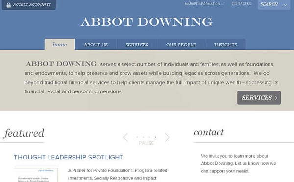 8. Abbot Downing Có khoảng 594 khách hàng gia đình, Abbot Downing phụ trách quản lý và tư vấn cho khối tài sản khoảng 32,2 tỷ USD. Danh sách dịch vụ của nó gồm có lập kế hoạch cho gia đình, quản lý tài sản, ngân hàng cá nhân, tín dụng và các dịch vụ hành chính. |