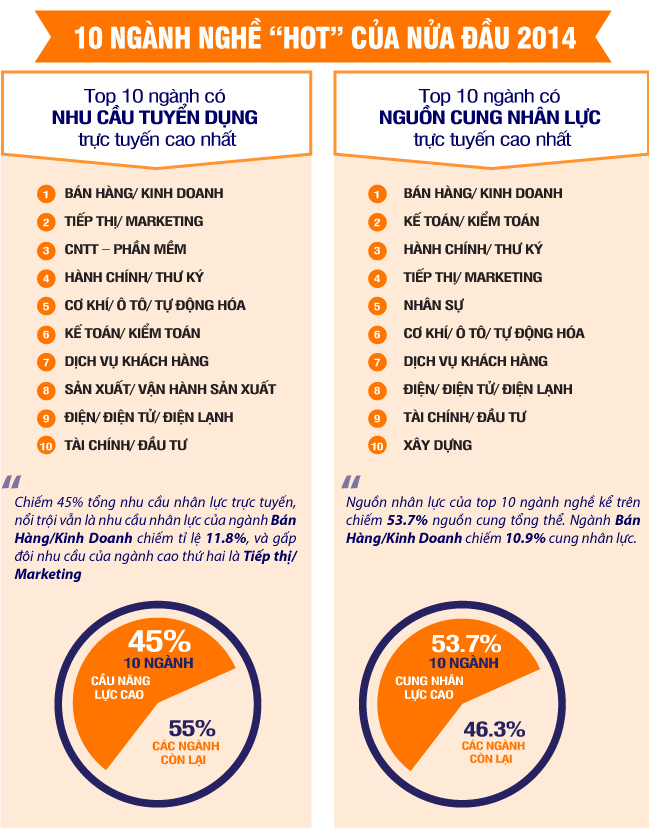 Theo kết quả báo cáo, Top 10 ngành nghề có nhu cầu tuyển dụng trực tuyến cao nhất chiếm 45% tổng nhu cầu tuyển dụng trực tuyến trong 6 tháng đầu năm 2014.