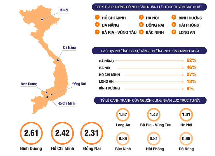 Mặc dù nhu cầu tuyển dụng tại các tỉnh thành miền Bắc và miền Trung (Hà Nội, Đà Nẵng, Bắc Ninh, Hải Phòng) nằm trong top 8 các tỉnh/thành phố có nhu cầu tuyển dụng cao nhưng tỷ lệ cạnh tranh nguồn cung lại không hề cao, ở thành phố Đà Nẵng là 0,68 và tại thành phố Bắc Ninh là 0,86.
