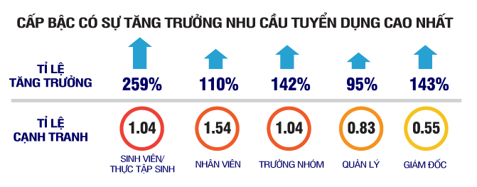 So với 6 tháng đầu năm 2013, nhu cầu tuyển dụng Sinh viên/thực tập sinh nửa đầu năm 2014 tăng trưởng mạnh nhất (tăng đến 259%).