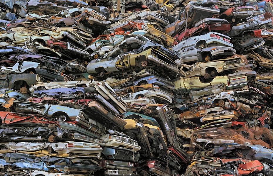 Những ôtô đã qua sử dụng bị đập bẹp và xếp chồng lên nhau chờ tái chế ở Mỹ. Quy trình kiểm tra phương tiện lưu thông nghiêm ngặt khiến nhiều người Mỹ quyết định bỏ xe cũ nhằm tránh phiền phức chúng có thể mang lại.