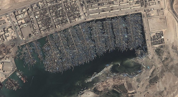 Nghĩa địa tàu thuyền khổng lồ ở Mauritania, quốc gia Hồi giáo Tây Phi. Từ vệ tinh, chúng ta có thể nhìn rõ những con tàu nằm la liệt ở cảng Nouadhibou chờ hóa kiếp. Chúng gây ra tình trạng ô nhiễm môi trường nghiêm trọng trong khu vực.