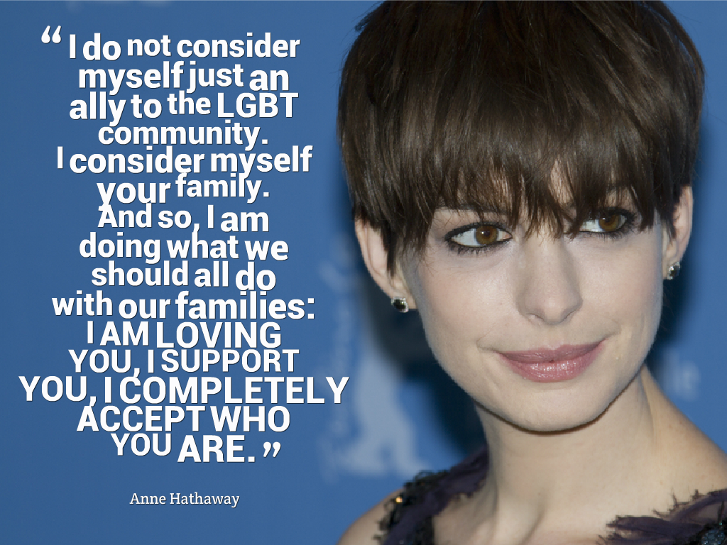 | Anne Hathaway không cho mình là "đồng minh", mà là một "thành viên gia đình" của cộng đồng LGBT và hết mình ủng hộ họ. |