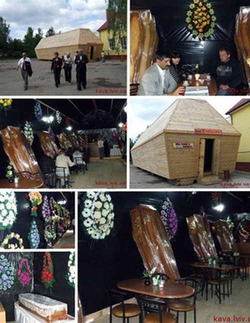 Đây là cỗ quan tài lớn nhất thế giới. Tới nhà hàng này, thực khách sẽ được "thưởng thức" những bản nhạc thê lương, ngắm những vật dụng trang trí như vòng hoa, quan tài, nến trong một bầu không khí tang tóc.