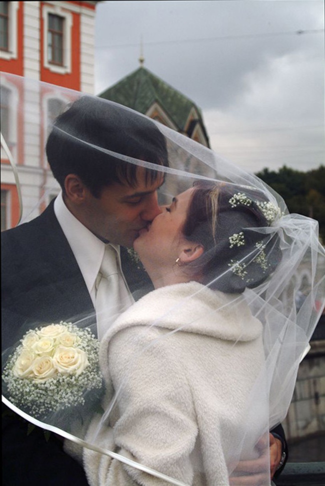 | Chú rể đang hôn vị hôn thê ngay phía trước nhà Thờ trong lễ phục sinh ở St. Petersburg, Nga. Ảnh: Richard T. Nowitz |