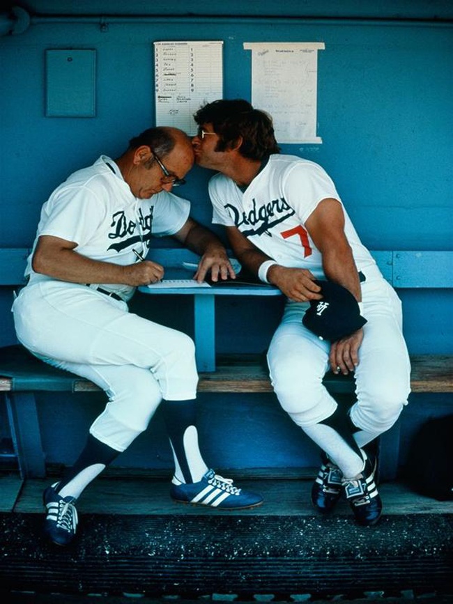 | Steve Yeager (phải) - tay bắt bóng của đội Los Angeles Dodgers hôn lên cái đầu hói của vị huấn luyện viên trước trận đấu năm 1978. Cảnh tượng này thể hiện tình thầy trò gắn bó trong môn thể thao được ưa chuộng nhất nước Mỹ . Ảnh: Jodi Cobb |