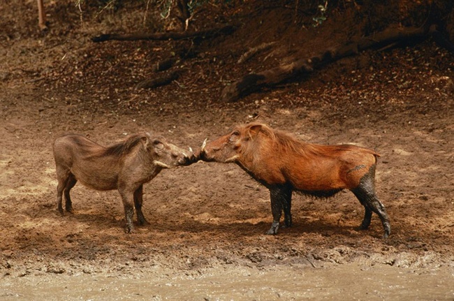 | Một con lợn rừng đực và một con cái ở Nam Phi làm quen bằng một nụ hôn ngọt ngào. Ảnh: National Geographic. |