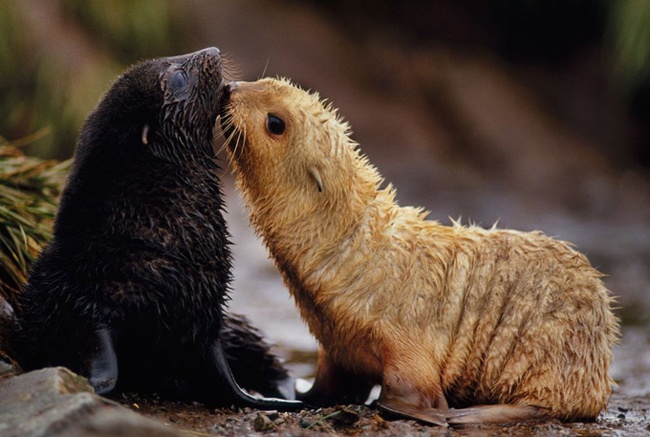 | Hai chú hải cẩu đang thể hiện tình cảm bằng cách ủi mũi vào nhau trên đảo South Georgia. Ảnh: Frans Lanting |