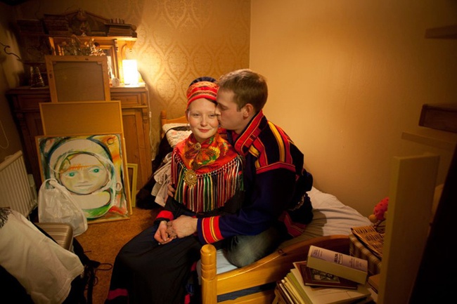 | Đôi bạn trẻ người Sami trong trang phục truyền thống chuẩn bị ra mắt bạn bè và gia đình trong phiên chợ Jokkmokk hàng năm ở phía bắc Thụy Điển. Ảnh: Erika Larsen |