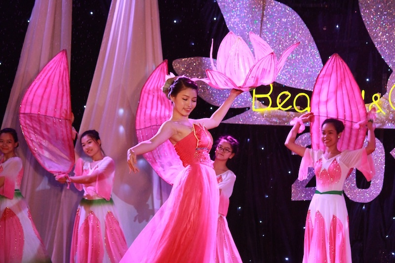 | Phần thi tài năng với muôn vàn màu sắc, những tài lẻ đặc biệt thú vị và bất ngờ của các nữ sinh. Trong ảnh là thí sinh Bùi Minh Ngọc với điệu múa “Dáng xuân”. |