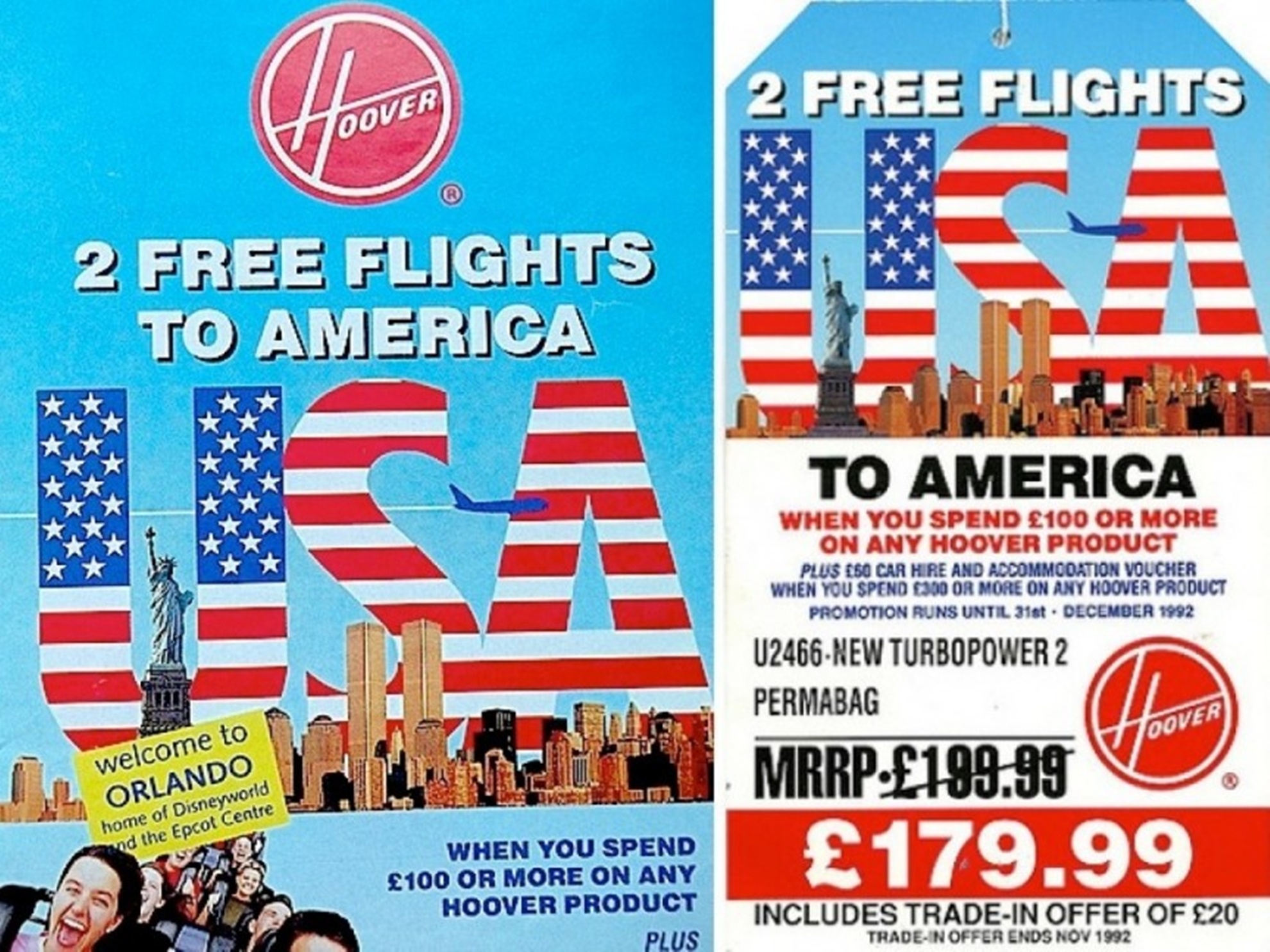 Không chỉ vậy, một thời gian ngắn sau công ty này còn quyết định tặng cả vé đi Mỹ. Người người đến mua hàng của Hoover đơn giản chỉ để được tặng vé máy bay miễn phí. Không lâu sau công ty này bị kiện, đến tận năm 1998 mọi thứ mới được dàn xếp ổn thỏa. Chi phí của Hoover phải chịu trong vụ việc này lên đến 80 triệu USD.