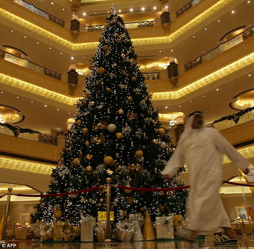 4. Cây thông Noel Năm 2011, khách sạn 7 sao Abu Dhabi đã ghi tên mình vào kỷ lục Guinness, khi sở hữu cây thông Noel đắt giá nhất thế giới. Với chiều cao gần 13m, cây thông này được treo đầy vòng hoa, quả cầu và đồ trang trí bằng vàng, với giá trị tới 11 triệu USD. |
